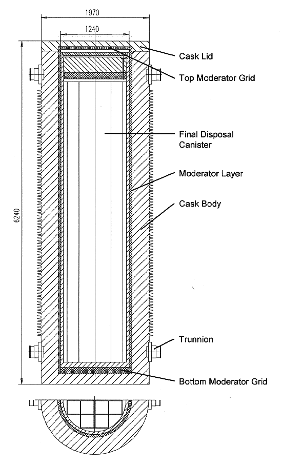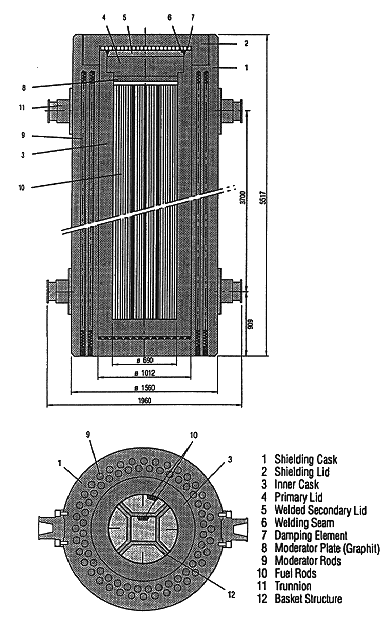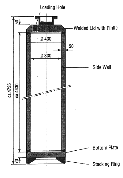 Figure. 1 shows the basic design of the final disposal cask POLLUX which consists of an inner cask with screw-fitted primary lid and welded secondary lid to maintain the leaktightness of the package and an outer cask with screwed lid which meets the requirements for shielding, heat removal and the mechanical protection of the inner cask. The consolidated spent fuel is deposited in packed canisters into the inner cask.