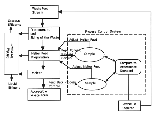 b. Feed back process control would require sampling of the product stream generally as the melt exits the melter. The composition of the glass would be related to the durability or durability testing could be done directly. If the sample results did not meet acceptance requirements, the glass would have to be reworked.