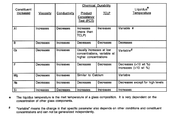 Table I lists the general effects various elements produce in a silica-based glass composition. Note in general that those components which make the glass more processible (i.e., lower the melt temperature or reduce the melt viscosity) tend to decrease the chemical durability of the glass. The glass durability versus processibility concern is the principal trade-off when waste glass compositions are formulated and tested (1).