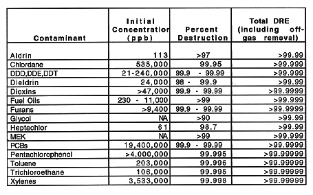 The DOE proposes to eliminate testing requirements for organic constituents identified in waste streams that will be vitrified because organic wastes are thermally destroyed by the vitrification process (vitrification systems typically operate in excess of 1000°C). The destruction occurs through pyrolysis in the melt and combustion in the plenum or in the secondary combustion chamber. Studies have been performed that demonstrate the destruction and removal efficiencies (DREs) for a number of organic contaminants and compounds (1). The DREs listed in Table II are values typical for In Situ Vitrification (ISV) systems. These values are conservative when compared with DREs for conventional melter systems with off-gas components designed to comply with (or exceed) air permit requirements. These DREs meet the requirements of 40 CFR Parts 264 and 265.