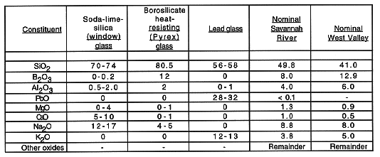 Table III shows several typical commercial glass compositions and the flexibility possible in formulating glass compositions (1). The proposed high-level waste glass for SRS and WVDP are shown for comparison.