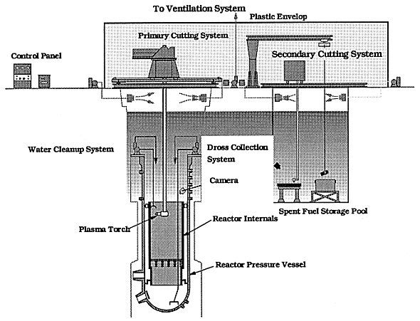 The reactor internals were removed by the underwater plasma arc cutting system. The plasma torch was operated in the most cases by a mast type manipulator. First, each reactor internal was removed from the reactor pressure vessel (RPV) wall, the cut pieces were then transferred underwater to the spent fuel storage pool through the canal. These pieces were cut into smaller segments suitable for packaging using another underwater arc saw cutting system. Figure 1 shows schematic diagram of the underwater plasma arc cutting systems. The RPV was dismantled using the underwater arc saw cutting system. Before installing the underwater arc saw cutting system, a temporary cylindrical water tank was installed in the space between the RPV and the biological shield. The tank was filled with water to cut the RPV underwater. The top flange portion of the RPV body was cut vertically into 9 pieces. The other parts were cut into 8 horizontal pieces and 9 vertical pieces. The pieces were washed by a water jet above the water surface before being put into containers. No significant radioactivity in the working environment was observed during the dismantling activities.