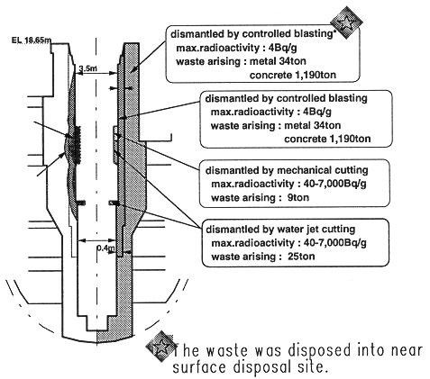 Following the dismantling of the RPV, the neutron-activated portion of the biological shield was dismantled using both the diamond sawing/coring and the abrasive water jet cutting techniques. Figure 2 shows schematic diagram of the biological shield, indicating radioactivity levels and the area classification. First the diamond sawing/coring, next the abrasive water jet cutting were applied to cut the upper and lower half of the projected portion of the biological shield, respectively. The controlled blasting was applied to the rest, which was only slightly activated. At first, the layer of 40 cm width from the inner surface was dismantled. The wastes were put into containers for storage. The outer layer of the biological shield was dismantled by both the controlled blasting and conventional tools. The concrete waste in the outer layer was disposed of in the near surface burial place in JAERI´s site, as the first test case.