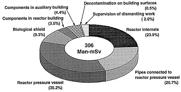 The radiation exposure of workers was one of the important data to characterized the dismantling activities. The total worker dose was measured to be 306 man*mSv, which was low enough to meet safety requirements. Figure 3 shows the breakdown of worker dose with regard to major dismantling activities. The most parts of worker dose were measured at the dismantling activities of installation of the water tank into the cavity between the biological shield and the RPV, and collecting of dross produced in cutting reactor internals. The major dose uptake occurred at hand-on work, even in the work which remote cutting machines were applied to. It was proved that detailed planning of dose control and estimation of dose rates at work areas were important to minimize unexpected worker dose in the dismantling procedures.