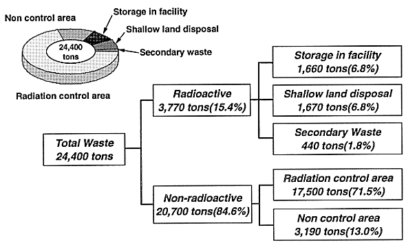 With regard to the waste, the total of 24,400 tons of waste including 3,340 tons of radioactive waste was produced in the all dismantling activities, as shown in Fig. 4. The extremely low level concrete waste was disposed into near surface burial place constructed in JAERI´s site. The concrete waste disposed in near surface burial place weighted 1,670 tons, which was 6.8 % of total waste.