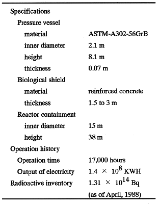 The JPDR is a BWR type demonstration reactor, of which power was initially 45 MWt (JPDR-I). It first generated electricity in October 1963, and it´s operation was continued by 1960. After that, the JPDR was improved to increase the power to 90 MWt for enhancement of the neutron irradiation capability (JPDR-II). The JPDR-II was finally shutdown in 1976 due to several problems such as cracking of the nozzle part of the in-core monitor tube and failure of the control rod drive mechanism. The total operation time and output of electricity were about 17,000 h and 1.4 108 kWh (440 FDD), respectively. Table I shows the major specification and operating histories of the JPDR. The JPDR had greatly contributed to developing nuclear energysuch as manufacturing of domestic nuclear fuels and taking measure of stress corrosion cracking through experience of various troubles.