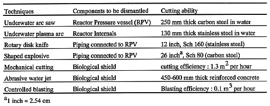 In the technology development phase, eight items on R&D was selected for decommissioning of the JPDR.(2) These include decommissioning systems engineering approach, radioactive inventory estimation, remote dismantling, decontamination, radiation control, remote handling and radioactive waste treatment. Especially, various dismantling techniques with remote operation were developed in the program to be applied to the actual dismantling activities for minimization of radiation exposure of workers.(3)-(5) For examples, it was confirmed that the underwater plasma arc and arc saw could cut stainless steal of 130 cm thickness and carbon steal of 250 cm thickness, respectively. These results were enough to be applied to the actual dismantling activities. Table II shows the main results of development of dismantling technologies.