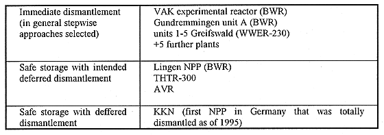 Obviously, there is a substantial amount of decommissioning experience in Germany. It covers all stages of decommissioning like immediate dismantlement, safe enclosure and dismantlement after safe enclosure and combinations of these basic patterns (Table I).