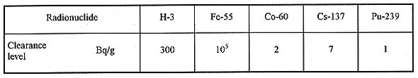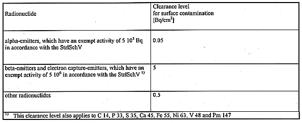 | - Unconditional clearance | Specific activity below 0.1 Bq/g, surface contamination below limits prescribed in ORP (Table III) |