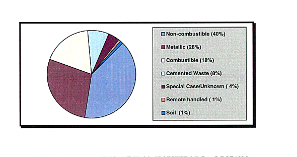 This volume includes combustible, noncombustible and cemented wastes, metallic scrap, special case and remote handled wastes, and soil. The percentage of these wastes are listed below in Fig. 1.