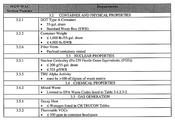 Table II Requirements set compiled from Table 3.2 of DOE/WIPP-069,