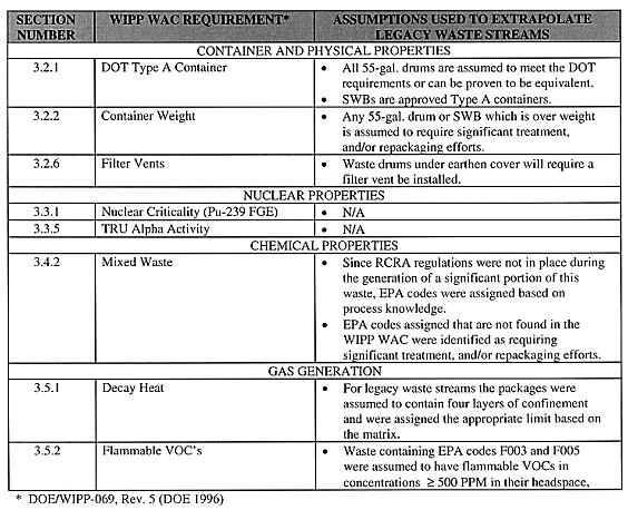 Since all of this waste was generated before the WIPP WAC, Rev. 5 criteria were published, several key assumptions were used in evaluating the data. These assumptions are listed below for each criterion.