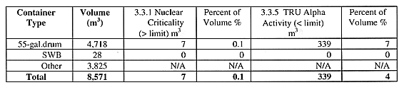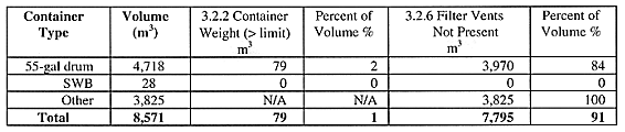 This volume was evaluated against a subset of the WIPP WAC, Rev. 5 criteria, to determine noncompliant volumes (see Table II for their description). The entire set of WIPP WAC could not be evaluated from the information presently in the database. A complete evaluation of the WIPP WAC will be conducted by LANL as part of the Characterization and Certification Programs to be conducted in FY97 and beyond .