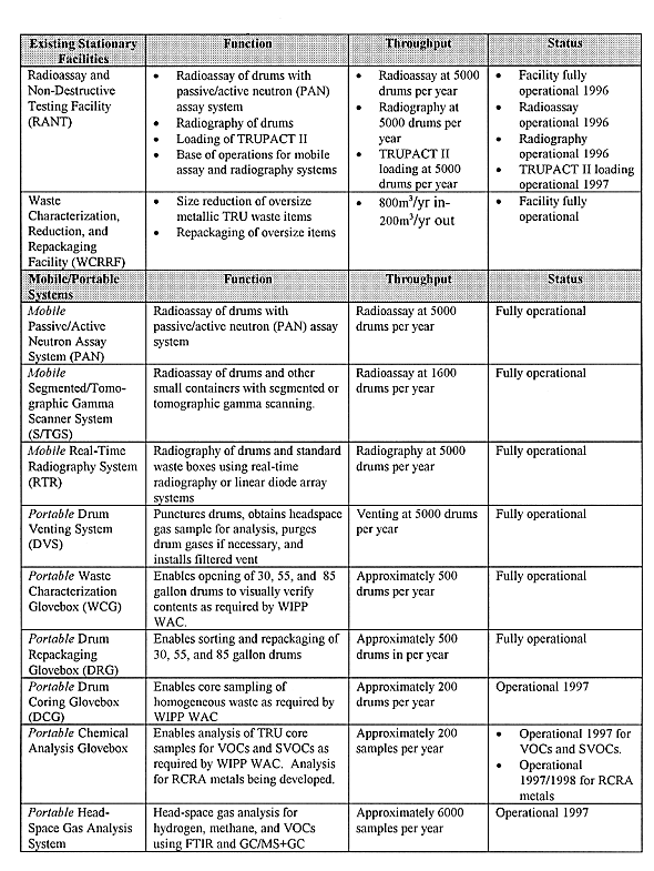 Table II lists the characterization systems being used at LANL, their function, throughput, and operational status. Note that the existing stationary facilities and their capabilities alone would not allow LANL to meet the characterization requirements for WIPP disposal. Supplementing the existing facilities with mobile and portable systems, however, provides LANL with all characterization capabilities required to characterize and certify 5000 drums/year for transport and disposal at WIPP.