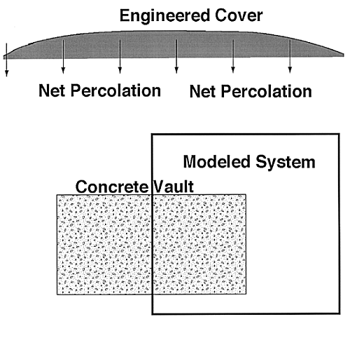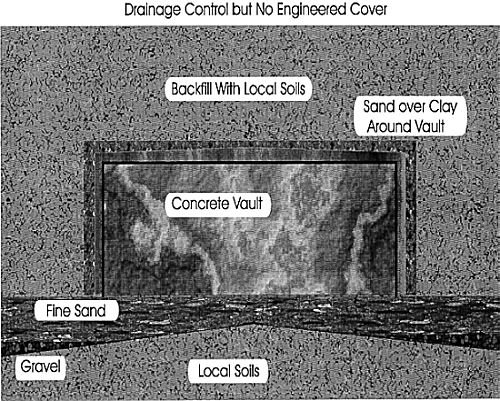 Current concepts for design of below ground concrete vaults evolved from the concept of placing an engineered soil cover over landfills. This paradigm leads to designs where the same type of engineered soil cover used for landfills is placed over below ground concrete vaults in order to reduce water infiltration through the soil above the concrete vault. The major problem with this logic is that the hydraulic performance of a concrete vault with a flow barrier placed adjacent to the concrete is relatively independent of the flow rate through the overlying engineered soil cover. An important additional consideration is that surficial related degradation and weathering processes operate most rapidly at the earth's surface and decline rapidly with depth of burial. Thus the engineered cover represents the portion of the disposal system most subject to degradation processes including oxidation of the geomembranes, plant roots, and burrowing animals.