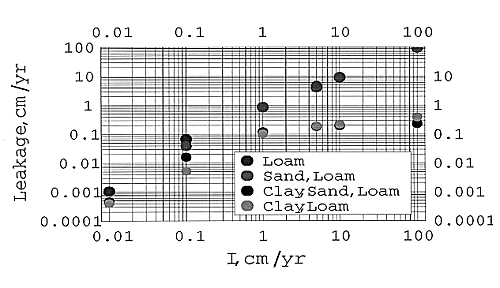 For intact concrete vaults (not shown) the flow rate through the vault rapidly becomes independent of leakage rate through the cover. For the degraded vault the flow rate through the vault with increasing infiltration depends strongly upon design. The degraded loam vault (default) allows nearly 100% of the infiltrating water to pass through the vault. The sand design has performance identical to loam at higher infiltration rates but provides the best performance at very low infiltration rates. The performance of the sand when infiltration is low results from the sand acting as a capillary barrier to flow. The clear limitation of capillary barriers is that they are easily overwhelmed by high flow rates and are subject to compaction induced hydraulic changes.