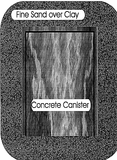 A second design is for individual cylindrical concrete canisters. The concrete canisters could be placed either inside a large concrete vault or without a surrounding concrete vault. The simple design places a clay layer around the canister followed by fine sand. The clay layer could be a geosynthetic consisting of a geomembrane with attached clay. The fine sand promotes drainage around the concrete canisters for both unsaturated and saturated flow conditions.