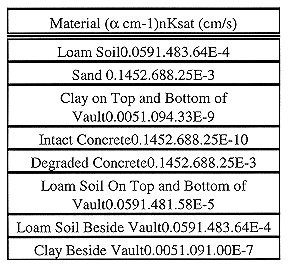 The hydraulic properties of the partially degraded concrete vaults are simulated by assuming that the vault itself has the unsaturated flow properties of coarse sand (i.e., fracture flow). The effective permeability of fractured concrete is, in general, a function of the hydraulic conductivity of surrounding porous materials since most resistance to flow is in the form of entrance/exit head losses (Walton and Seitz, 1992). Permeability of adjacent layers has been modified to reflect this. Since the precise properties of a concrete vault over time are highly variable and uncertain, simple assumptions are used to reflect the fact that any concrete vault or canister will eventually crack and become more permeable to water. The difficult challenge is to design vaults such that they work well not just with new, intact materials, but also work well as the materials degrade over time. Material properties assumed are listed in Table I.