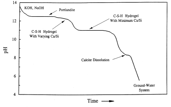 The long-term evolution of pH in cement pore fluids can be conveniently divided into three different environments depending on the cement phases that is acting as the buffering agent (19). Environment I corresponds to the initial high pH, high ionic strength environment (pH>12.5) created by the leaching of NaOH and KOH from the cement matrix. Environment II corresponds to the time period when the dissolution of portlandite buffers the pH of the system to about 12.5. Environment III corresponds to the time period when the solubility of CSH phases buffers the pH to values between 12.5 and 10.5.
