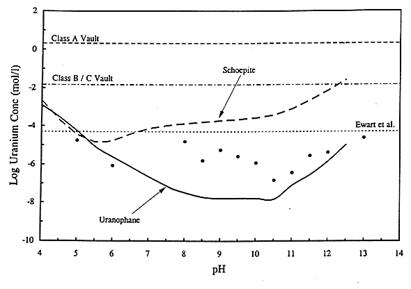 The uranium concentrations calculated using a rinse release model from the NRC LLW PA Test Case are shown as thin dashed and dashed-dotted horizontal lines in Fig. 2. This model assumes quantitative transfer of the U inventory in a vault (prior to application of solubility limits or sorption coefficients) into water volume fluxes of 1,000 and 100 ft3/yr for 238U in ClassA and B/C vaults, respectively (1). These values were selected for plotting purposes, because they bound the highest possible uranium concentrations. These two values are very extreme relative to any reasonable estimate of release because they do not take into account physical, kinetic, or thermodynamic controls on the dissolution of U. In addition, these water flux values represent the low end of the ranges calculated in NRC's Test Case (1). The solubility limits calculated for uranium thus provide a more accurate constraint on the upper concentration limits for uranium, which can be used in a PA model.
