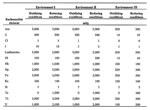 We have developed a data base of Kd values for these different cement environments that also take into account whether the environment is reducing or oxidizing (see Table I). Place Table I here. The example is illustrative of the approach that one could take in developing a basis set of Kd values for a specific site and facility design. These numbers should not be taken as a default set of values that are valid or necessarily conservative for any and all cement-based LLW systems. It is always the responsibility of the developer to provide the regulator with the rationale and basis for a particular modeling approach and to be able to defend and justify the data used in the model. In addition, for the purposes of a PA, one may wish to develop a range of values that may more realistically represent the state of knowledge about sorption of particular radionuclides on a specific type of cement to be used in a facility. This might include information from laboratory experiments, field studies, and natural analog studies.