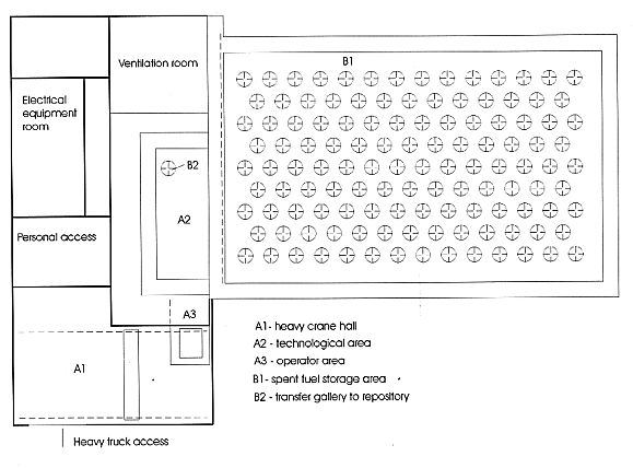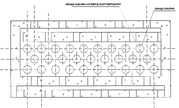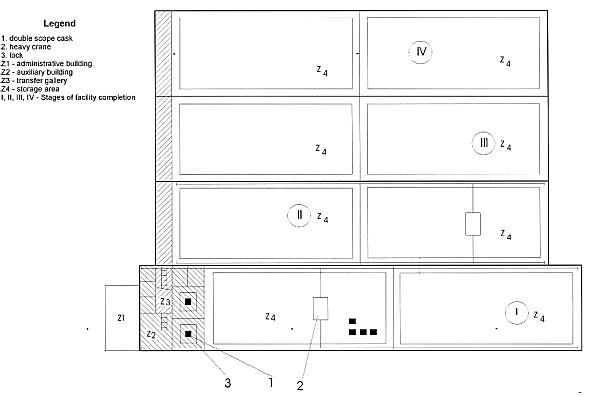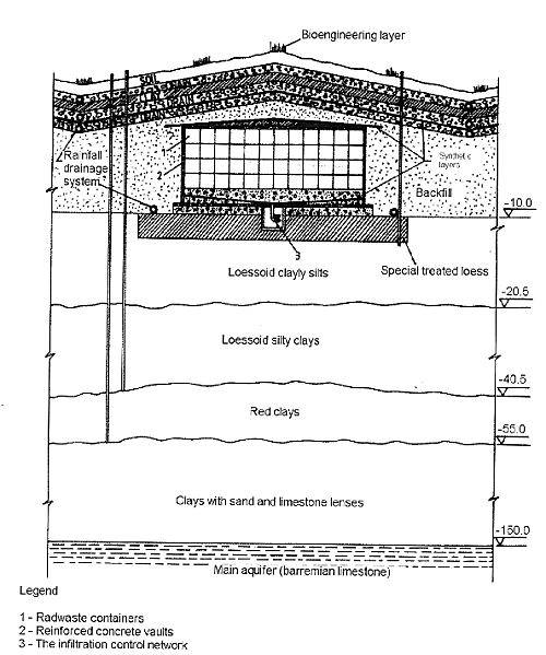 The near surface L/ILW disposal facility dedicated to Cernavoda NPP will be built in the exclusion area of the plant on a rich clay site. The facility will be designed to cover the disposal capacity required by Cernavoda plant (five reactors) over life-time, including the decommissioning wastes. The first capacity of Cernavoda L/ILW repository, dedicated for two CANDU reactors, will be completed in 2005. The waste packages are placed inside modular concrete containers that in turn are stacked within engineered disposal structure (Fig. 4.). The floors of the disposal structures collect any infiltrating water and channel it away from the structure for monitoring. The disposal structure will be covered with layers of artificial and natural materials designated to prevent the effects of infiltration or erosion by wind or water as well as the intrusion by plants and animals. The multiple barrier system is designed to last for 300 years.