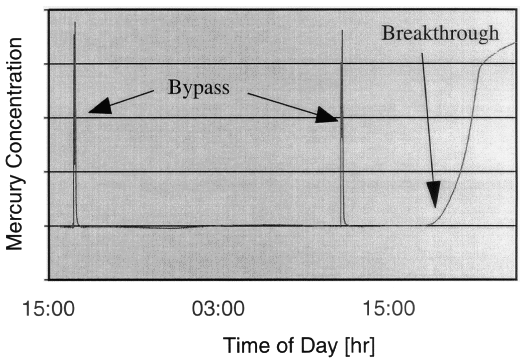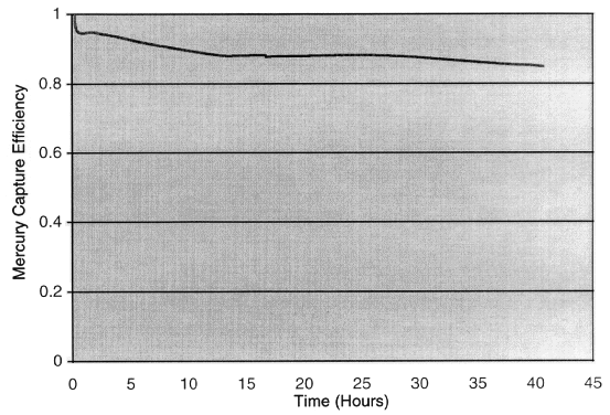 Representative results are depicted in Figs. 1 through 4. In Fig. 1, a gold-spiked carbon bed sorbs essentially all of the mercury for more than 24 hours before mercury vapor breaks through. In Fig. 2, a gold-spiked alumina sorbent takes up mercury for approximately 40 hours. The breakthrough shoulder is broad; the capture efficiency falls below 90% after 10 hours but stays above 85% for the next 30 hours.