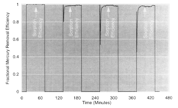 In Fig. 3, mercury is sorbed to over 98% efficiency for 60 minutes by a gold-spiked alumina sorbent, and these beads are repeatedly regenerated by heating to 600°F. In Fig. 4, mercury is sorbed to 99% efficiency for 80 minutes by a ceramic filter into which sorbent has been imbibed, and the filter is repeatedly regenerated by heating to 700°F.