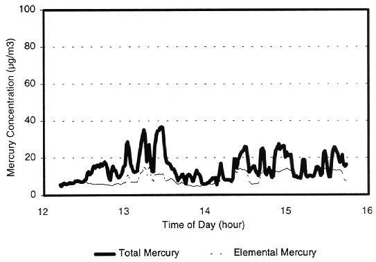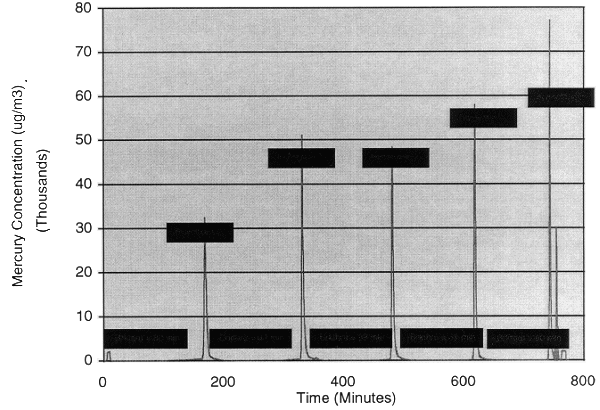 During the field test, several measurements were made of mercury concentrations using the Mercury Speciation Sampling Train (MSST) and Draft EPA Method 29. These sample trains were used to determine the concentration of mercury in the uncontrolled flue gas. Mass balance calculations (based on analysis of the feed material and system flue gas flow rates) predicted that the average mercury concentration would be over 10,000 µg/m3. To measure these high concentrations with the CEM, a dilution probe was used to reduce the mercury concentrations by approximately two orders of magnitude. The analyzer readings verified the mass balance predictions. The range of concentrations measured using the analyzer (11,300 to 18,100 µg/m3) agree well with the MSST samples (14,100 to 19,000 µg/m3). Results using Draft Method 29 were well below analyzer results, ranging from 3,700 to 8,600 µg/m3. It is suspected that the Method 29 impinger solutions may have been overloaded given the high mercury concentrations in the flue gas.
