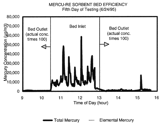 The thermal treatment system consists of a plasma hearth chamber, a secondary combustor, an acid gas scrubber, a baghouse, and a bank of HEAP filters. Figure 5 shows that the mercury concentrations at the inlet to the sorbent beds were in the range of 10,000 µg/m3 to 60,000 µg/m3, and that the inlet concentrations were much higher than the outlet concentrations. Typical mercury removal efficiencies exceeded 99%. Figure 6 shows concentrations of total and elemental mercury leaving the scrubber over a 4-hour period of time. The "spikes" in concentration correlate to the input of wastes to the thermal treatment unit. The difference in mercury readings between the total and elemental measurements is the concentration of speciated mercury (i.e., the concentration of chemically combined mercury.) The measurement of the mercury concentrations were made with ADA's continuous, speciating mercury analyzer. This analyzer measures the concentration of elemental mercury and of all other mercury-containing compounds simultaneously and in real-time, down to concentrations of 0.2 µg/m3 (Roberts, et al., 1996). The analyzer responded rapidly to changes in mercury concentration. The surrogate waste was fed by inserting a can into the hearth approximately every 20 minutes, resulting in a pulse of mercury in the flue gas.