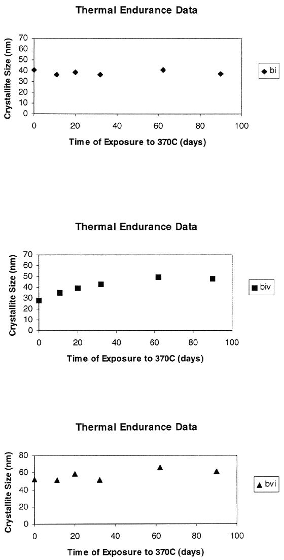 We have exposed three sorbents to the regeneration temperature for 90 days, representing 540 days of commercial operation. So far, one of the three sorbents is quite stable, one is approaching a stable crystallite size, and the other needs more data to be sure that it is stable (Fig. 7). The thermal stability of the sorbent appears to be sufficient for commercial operation.