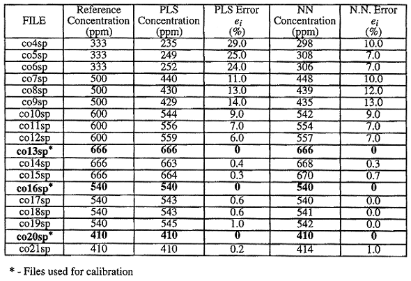 The summed-squared error for the neural network technique is 892 and the summed-squared error for the PLS technique is 2,285. The worst case error for the neural network technique is 13.0 and the worst case the error for the PLS technique is 29.0. Both measures show that the neural network produces a more accurate estimate of the CO concentration in excess of a factor of two.
