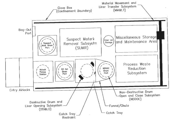 Working in conjunction with the MM<, the function of the Destructive Drum and Liner Opening subsystem (DD&LO) is to destructively open damaged drums to allow access to the liners for transfer. It also can destructively open the drum liner to allow access to the drum contents. Specific operations performed in the substation include: