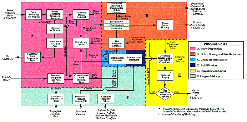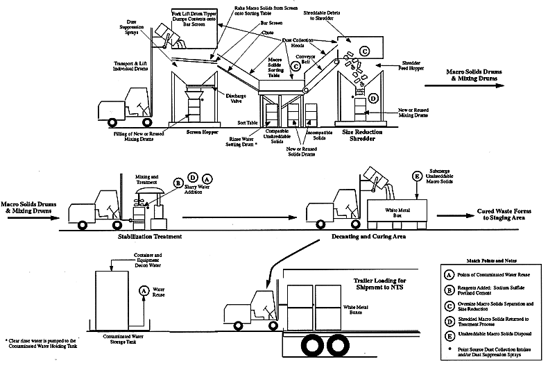 This section describes the sequence of operations that comprised the production process. Figure 1 is a block flow diagram of the mixed waste stabilization process. Figure 2 is a schematic diagram illustrating the treatment process. The individual process units, which made up the waste treatment production process, are enclosed by dashed lines in Fig. 1 and as designated as follows: