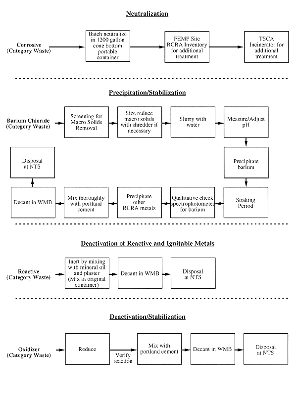 Wastes in the oxidizer category are hazardous because of their tendency to react with other chemicals in a sometimes violent oxidation/reduction reaction. Deactivation treatment takes advantage of this tendency by adding reducing agents in a safe and controlled manner to bring the oxidation/reduction reaction to completion before the waste is offered for disposal. Most of the wastes to be treated by deactivation were nitrate salts of various metals (sodium, potassium, uranium, and thorium). In addition, thorium was present in its oxide and fluoride forms. RCRA metals of concern included barium, chromium, lead, and mercury.