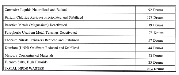 The 2,800 drums of treated waste included grit blast residues, solidified furnace salts, sump cakes, construction rubble, uranium oxide, barium residues, corrosive liquids, reactive solids, uranium metal turnings, low concentration mercury contaminated soils, and oxidizers (thorium nitrate and uranyl nitrate hexahydrate).