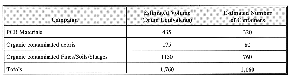 | Phase III | Production treatment of 60 cubic yards (414 drum equivalents) of PCB-contaminated mixed waste and 210 cubic yards (1,306 drum equivalents) of debris and fines/soils/sludges contaminated with organic constituents. |