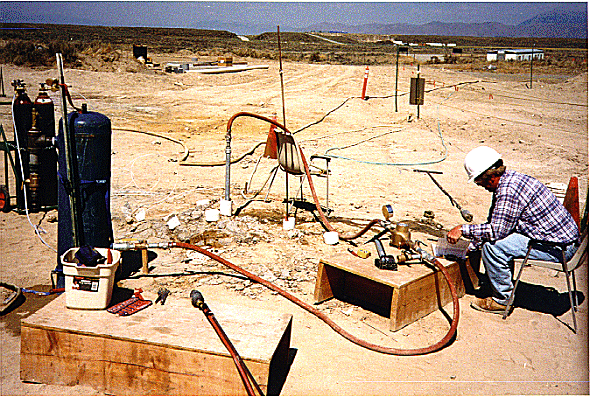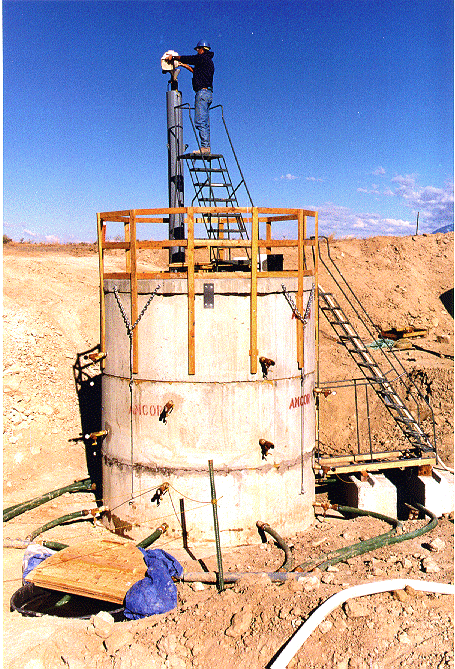 Prior to emplacement of the lids, the systems were saturated by maintaining a standing head of water of about 0.3 m inside the top ring as previously described. This was accomplished with the bottom valves both open and closed to ensure a flow of water through the system. Once saturation conditions occurred (evidenced by a weekend head check with no change in level in the top pool surface of the culvert), the lids were emplaced, and the head pipes and associated safety ladders were installed. Water was introduced to the head pipes, and it was immediately obvious that a 3-m head of water could not be obtained because of copious leakage out the seal between the lid and the top ring of the culvert.