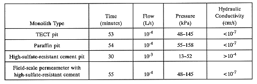 Results of the packer testing of both TECT and paraffin pits and high-sulfate-resistant cement indicated that the general matrix is less than 10-7 cm/s hydraulic conductivity. In addition, results of packer testing in select core holes in the high-sulfate-resistant cement pit suggested hydraulic conductivity as high as 10-3cm/s. This isolated high hydraulic conductivity is attributed to a poorly cured soil/waste/grout matrix that is porous due to the presence of sodium sulfate, which is a stand-in for potassium nitrate in the actual waste.