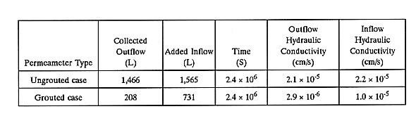 There are two possible explanations for the large discrepancy between the inflow and outflow. The first possibility is that a combination of small unmeasurable leaks that could be visually classified as "weeps" accounted for the mass difference. The second explanation is that the cured high-sulfate resistant Portland cement itself may be absorbing the excess inflow fluid. There was no way to quantify the collected weeps nor the potential effect of absorption of the cement, so these ideas are only speculative. If the desired value of 10-7 cm/s had been achieved, no water would have been collected in the 2.4 (breve) 106-second testing period, because any water collected would have been on the order of evaporative losses.