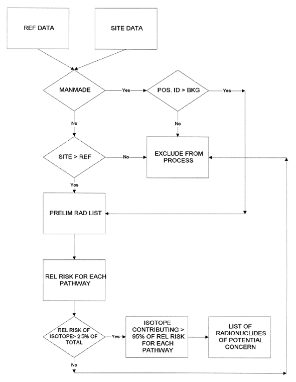 For the propose of this paper the following proposed COCP selection method is developed to obtain radionuclides of potential concern (ROPC). This method follows the steps shown in Fig. 1. First, data would be examined to identify those radionuclides that are not naturally present in the environment. Any positive indication (concentrations greater than minimum detection limit (MDL)) that a man-made radionuclide is present would lead to its inclusion in the ROPC list. Next the individual naturally occurring radionuclides concentrations in the site field and sampling activity would be compared with theconcentrations of the same radionuclides in the reference data (background samples, which are defined as samples from areas that have not effected by the site operation and waste management practices). This comparison would be made employing a statistical hypothesis testing method such as Wilcox on rank sum, Quantile stet, or a similar and applicable method. If the result of site and reference comparison is not significantly different , acceptance of the null hypothesis (H0), then the radionuclide would be excluded from the ROPC list. In addition the effect of reported measurement method uncertainties should be considered. As the final step in the identification process, the remaining radionuclides are ranked according to their potential relative risk (percent risk contribution to the total risk) using the median concentration of each radionuclide in the medium of concern for each of the primary pathways. Those radionuclides contributing the least (2.5% or less on an individual radionuclide basis) relative risk would be eliminated from further analysis. US EPA usually has a simplistic and very conservative approach to selection of the COPC that could cause unnecessary actions which in turn would result in prolonged cleanup schedule and costly cleanup activities.