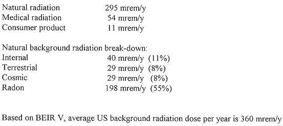 EPA has defined its average lifetime target risk range as 10-6 to 10-4 for the lower and upper limits of risk to human health due to site related contaminants. Even though these limits might work for chemical contaminants, its application to the radionuclides does not seem appropriate. For perspective consider the probability of an individual developing cancer from exposure to naturally occurring background radiation (Table I). Unlike many other risks, exposure to natural radiation is unavoidable. The lifetime risk of cancer due to natural background radiation is approximately 1.4 x 10-2 which is 100 times greater than the EPA upper bound of target risk to human health.