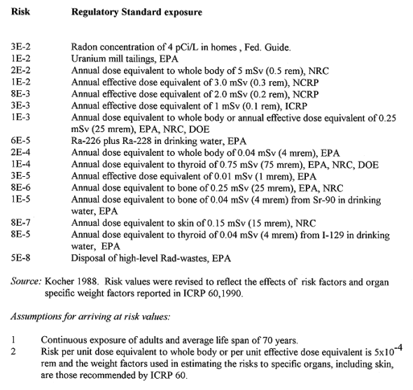 In addition it should be noted that there are significant inconsistencies among current radiation protection standards regarding the acceptable level of risk attributable to radiation. Table II presents a summary of the estimated lifetime risk to public associated with selected standards. To estimate the risk values recent risk factor and organ-specific weight factors reported in ICRP 60 are used rather than those reported in ICRP 28. Following observation could be made regarding these radiation protection and environmental radiation standards for the public.