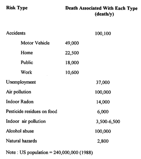 In day to day life, humans are being surrounded by many types of risk such as accidents (motor vehicle, home, public, work place, etc.) , occupational, unemployment, overweight, social connection/socioeconomic factors, use of compact cars, active and passive smoking, air pollution/environmental/natural hazards, geographical locality, medical, sports, epidemics, and energy consumption. In general, we live in a risk oriented society and consciously or unconsciously we are taking risk every day.