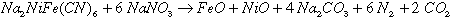 Based on the results of three independent experimental studies on ferrocyanide waste simulants, a value of -6 MJ/kg of Na2NiFe(CN)6 was assigned for the reaction products produced(11). This is 63% of the theoretical energy for Eq. (1) and 90% of the energy if N2O is the product gas.