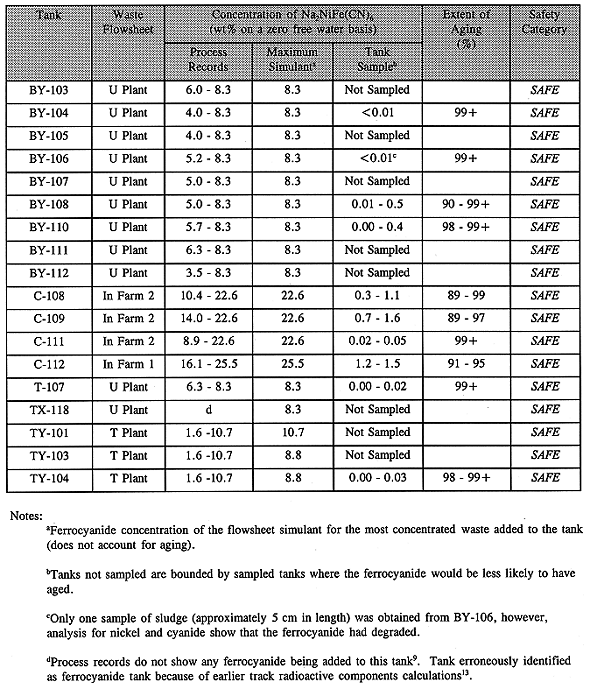 The U-Plant and T-Plant ferrocyanide flowsheet wastes added to the 14 Hanford Site tanks constitutes about 74% of the ferrocyanide added. This fraction of waste was insufficient in fuel value when first formed to support a propagating reaction even if dry (zero free water). However, the remaining fraction of ferrocyanide waste produced by the In-Farm flowsheet was significantly higher in ferrocyanide concentration and was stored in four C-Farm tanks. Samples were obtained and analyzed from ten of the ferrocyanide tanks including all four of the worst-case C-Farm tanks. These tanks bound the aging conditions for the unsampled tanks. The results showed that all the waste in the 18 ferrocyanide tanks are now too low in ferrocyanide concentration to support a propagating reaction. This decrease in concentration is credited to chemical aging that occurred over the 40 or more years of storage. The tanks are now categorized as SAFE with regard to the Ferrocyanide Safety Issue.