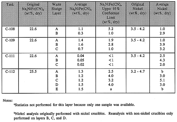If the waste samples had sufficiently high nickel concentrations to conclude that it originally contained ferrocyanide sludge, then waste aging was confirmed. If the waste had a low nickel concentration, then the tank might have been erroneously identified as containing ferrocyanide waste, or another explanation may apply. For example, many of the ferrocyanide tanks received saltcake waste that showed little or no nickel present, while other ferrocyanide tanks received just sludges. None of the added waste would have contained nickel. Additional mixing that undoubtedly occurred under some of the risers would have diluted the nickel results.