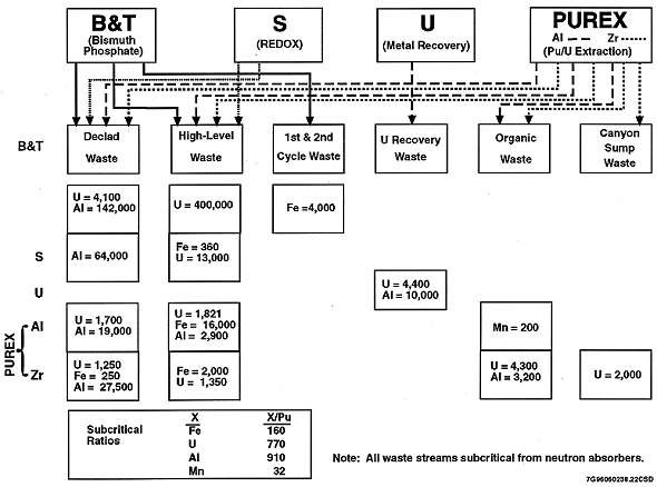 Figure 1 is a summary graphic of the neutron absorber-to-plutonium ratio for each Hanford Site process waste stream entering the waste tanks based on flowsheet composition. Shown below each of the waste streams are the absorber-to-plutonium ratios (X:Pu) based on the flowsheet composition for each waste stream. The minimum ratios necessary to ensure subcriticality for each absorber type are summarized at the bottom of the graphic. This figure illustrates that each waste stream contains sufficient neutron absorbers of at least one type (if not more) to maintain a subcritical composition, irrespective of any other neutronic condition.