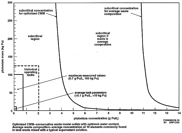 Figure 2 is a summary graphic representation of the significant margin of subcriticality of the waste. The graphic compares actual waste parameters and operating limits (lower left corner) to calculated subcritical concentration limits as identified by the two curves. The two subcritical concentration curves show the degree of conservatism that has been included in the criticality safety analysis of the Hanford Site tank wastes. The "optimized conservative waste model (CWM)" subcritical concentration represents conservatively modeled waste conditions. The "average waste composition" represents subcritical concentrations for a waste composition representing an average composition of 19 elements from 28 tank samples. All cases are calculated using additional conservatism (e.g., assumes a sphere geometry). Figure 2 shows that even with a high degree of conservatism, the waste tank contents are highly subcritical.