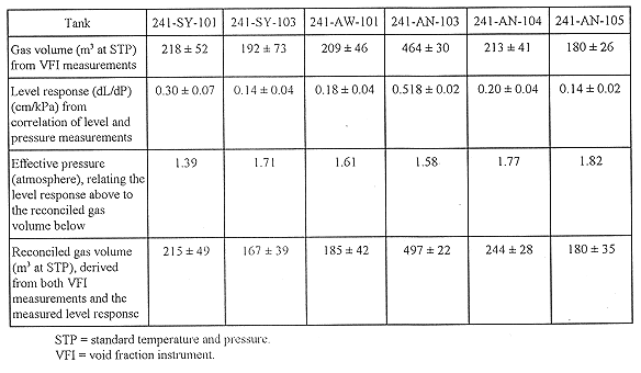 Evaluating the flammable gas hazard in a particular tank requires an estimate of the volume of gas retained, the fraction of the retained gas that can be released, and the speed with which it might enter the tank headspace. One method of obtaining some of this information is by measuring the void fraction at specific locations in a tank and then calculating the total gas volume. Table II shows the data taken in six Flammable Gas Watch List double-shell tanks and the resulting calculated gas volume data.(12) Tank 241-AN-103 contained the most gas; it was comparable to tank 241-SY-101 prior to mixing. Tank 241-AW-101 contained the least gas in the nonconvective layer but was very similar to tanks 241-AN-104, 241-AN-105, and 241-SY-103. The waste height measurements taken in Hanford Site waste tanks often show a strong correlation to barometric pressure, indicating the presence of retained gas. This level response can be used to estimate the retained gas volume provided information about the pressure at which the gas is held is available. Such information is shown in the table and was used to provide a reconciled gas volume.